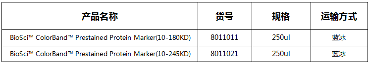 BioSciTM ColorBandTM Prestained Protein Marker 是一種三色預(yù)染的即用型蛋白分子量標(biāo)準(zhǔn)品,包括十種分子量從的預(yù)染重組蛋白,經(jīng)SDS-PAGE凝膠電泳或轉(zhuǎn)膜后可觀察到清晰的彩色蛋白條帶,其中25KD為綠色條帶,75KD為紅色條帶,其余條均為藍(lán)色條帶。