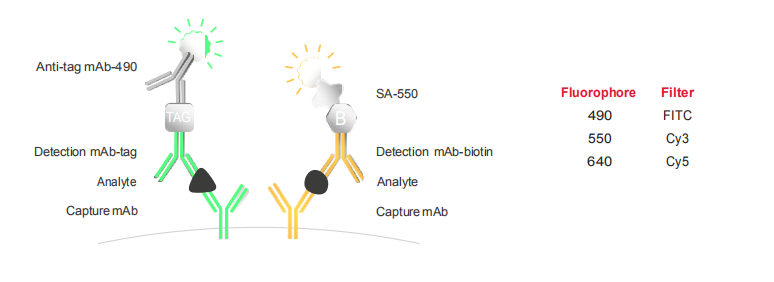 FluoroSpot用途廣泛,并且同樣適用于單個檢測和大規模篩選。三明治夾心法結合熒光基團標記的檢測試劑能夠對同一個孔中兩個或兩個以上的分析物進行分析。