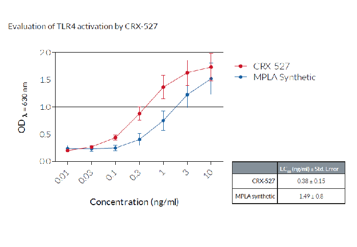 將細胞分別與遞增濃度的CRX-527、合成的單磷酰脂質A(MPLA)孵育。在HEK-BlueTM檢測培養基(SEAP檢測生長培養基)中孵育過夜后,通過測定上清液中是否存在SEAP來評估TLR4的活化。數據表示為OD(λ=630nm)(±SEM)