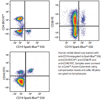 使用抗CD19-Spark Blue?550CD4-BV570?、CD38-PE以及CD40-FITC等不同組合抗體對人全血進行染色。圖中數據均來至于淋巴細胞門。結果可以看出SparkBlue?550可以完全與FITCPE熒光區別開,該數據使用Cytek?Aurora流式儀檢測。