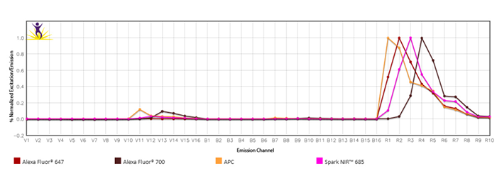 由于近紅外(NIR)范圍內的熒光發射光譜以及光電倍增管(PMT)對800nm以上發射波長的不敏感性,633nm紅色激光器僅限于2-3個熒光。借助全光譜流式細胞儀,APCAlexaFluor?700的發射峰之間的光譜間隙可檢測Spark NIR?685等新型熒光。Spark NIR?685可被633 nm激發,最大發射波長為685 nm,與FITC具有相似的亮度。