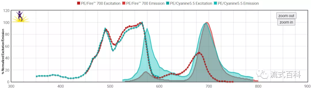 很顯然,在傳統的流式平臺PE/Fire? 700和PE/Cyanine5.5是不可以使用在同一個panel中的,但是在光譜流式中,兩種熒光染料由于其光譜特性存在一定的差異,是可以區分開: